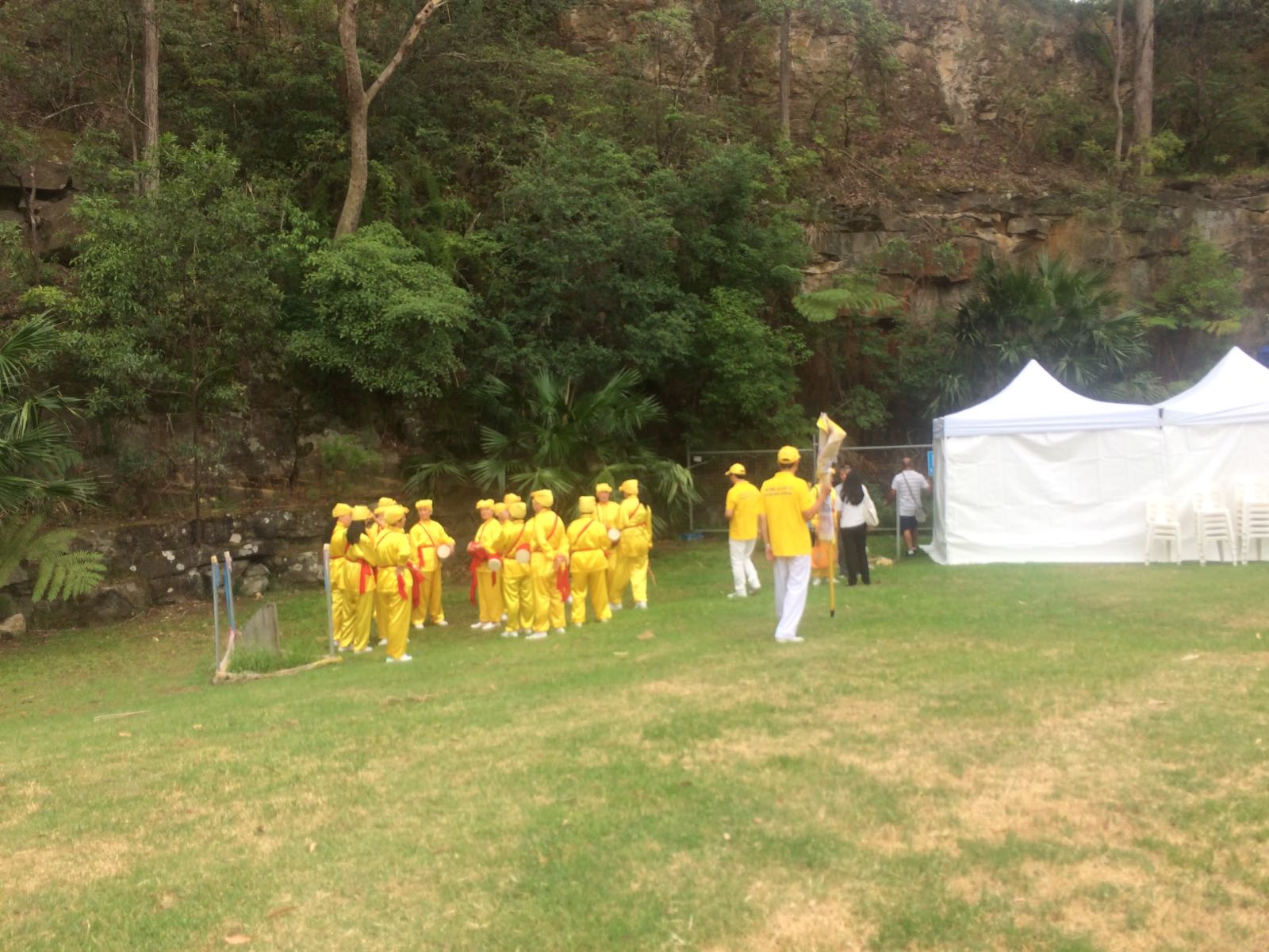 I sat between an area where sheep shearing was displayed and a stage where various gigs were taking place. Suddenly I saw two men in bright yellow clothes, with a ’Falun Gong’ label on their shirts. Then I saw packs of them queued up behind the big tent covering the stage.